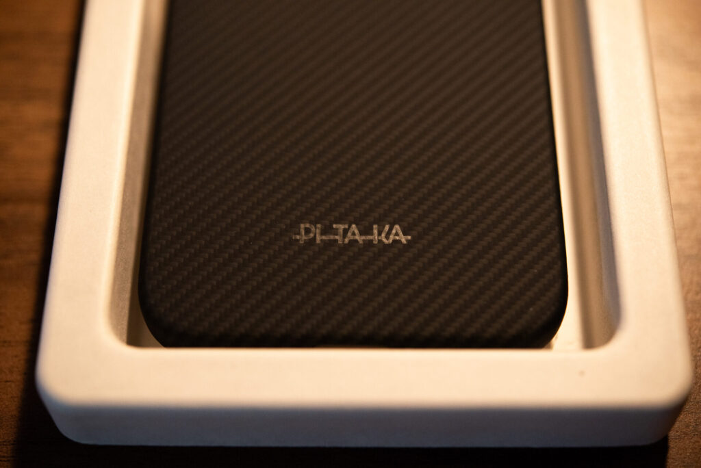 本体下部には控えめに光の加減で姿を現す「PITAKA」のロゴがプリント。