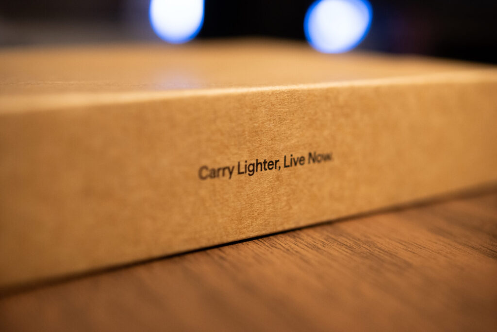 ダンボールの側面に書かれた「Carry Lighter, Live Now」の文字。